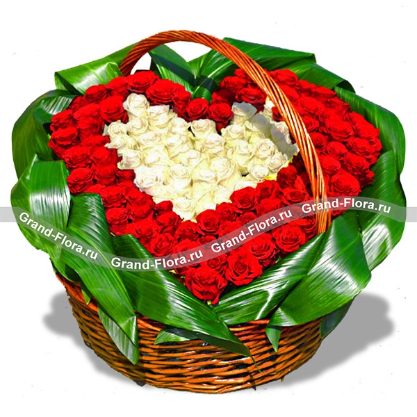 Вместе навсегда - корзина из красных и белых роз в виде сердца