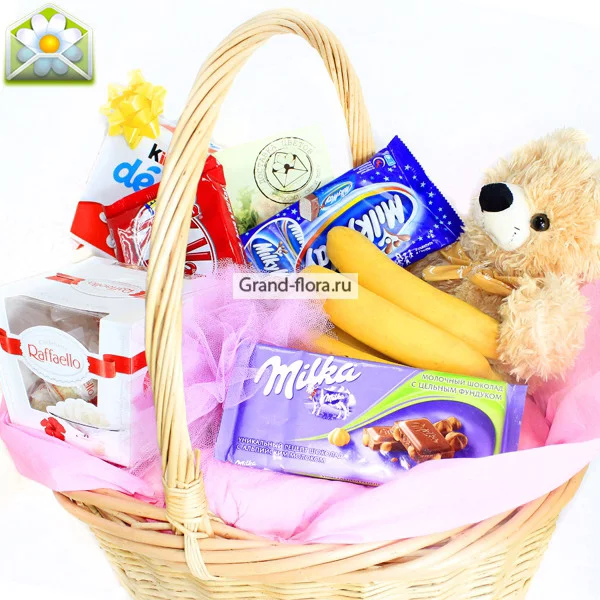 Наши феи-флористы собирают продукты для этой корзины в лучших супермаркетах! Здесь есть все, что нужно для прекрасного настроения и сказочной радости.
