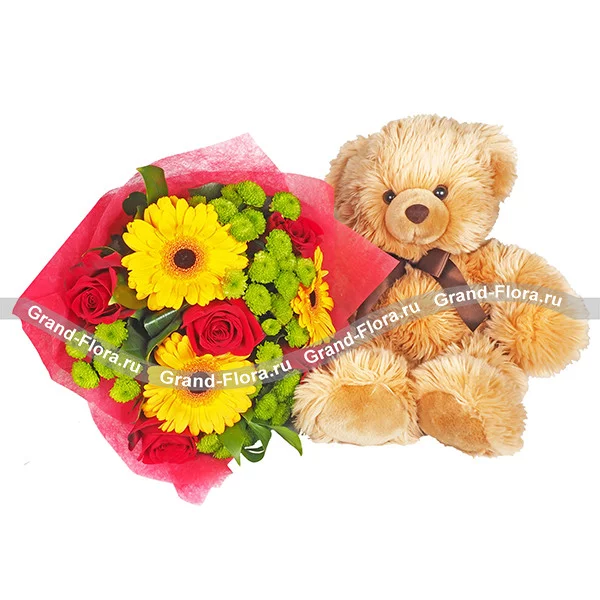 Стандартный (на фото): гербера желтая - 3 шт, роза красная - 5 шт, хризантема кустовая зеленая 3 шт, фетр красный + мягкая игрушка "Медведь" (размер 25-30 см. Коричневый)