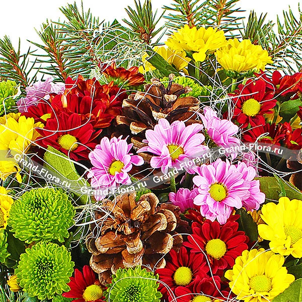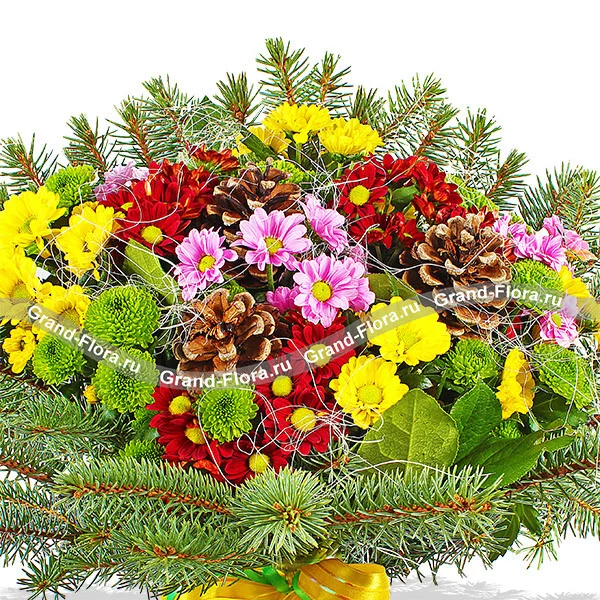 Стандартный (на фото): хризантема желтая ромашковидная - 3 шт., хризантема розовая ромашковидная - 3 шт., хризантема зеленая (сантини) - 3 шт., хризантема красная ромашковидная - 3 шт., еловая ветвь, новогодний декор и зелень, сетка, бант желтый.