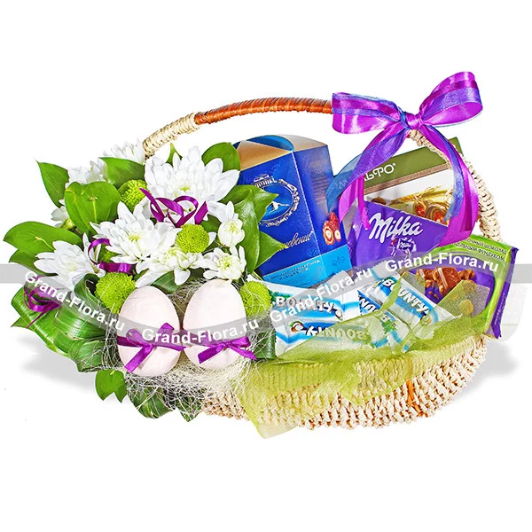 Уменьшенный: хризантема кустовая белая - 1 шт, хризантема куствая зеленая - 1 шт, рускус, оазис, декоративное яйцо - 1 шт, конфеты "Вдохновение" - 150 гр, конфеты "Комильфо" - 118 гр, шоколадные батончики "bounti mini" - 4 шт, декор, бант фиолетовый, корзина малая.