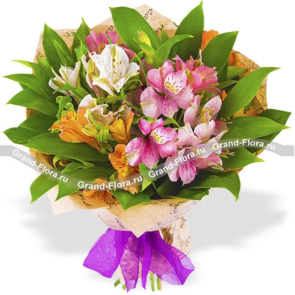 Стандартный: альстромерия разноцветная - 9 шт., декоративная зелень, упаковка крафт, лента фиолетовая.