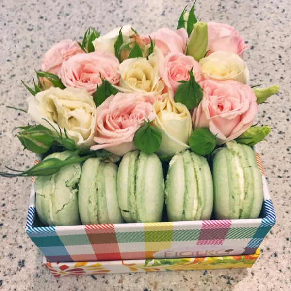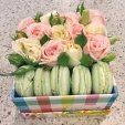 Доставка данной композиции возможна только по России! Возможна замена макарунов на зефир или конфеты Raffaello. Дизайн коробки может отличаться от картинки! Просим оформлять данный вид композиции заранее