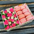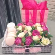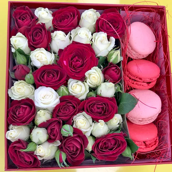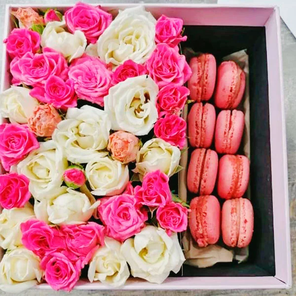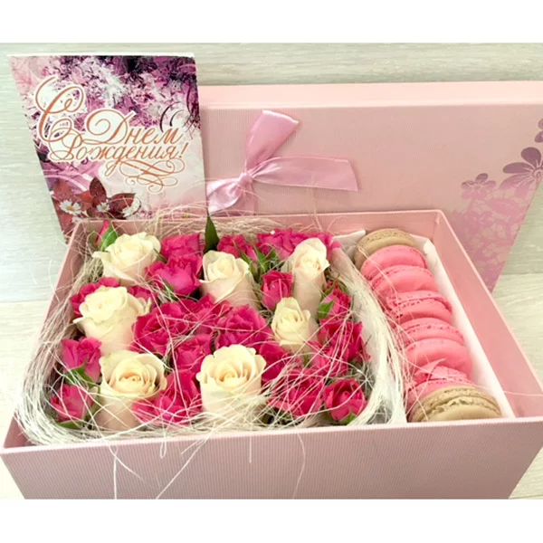 Уменьшенный: роза кустовая розовая - 2 шт., роза кустовая белая - 1 шт., макаруны (возможна замена на зефир), декор, оазис, коробка малая.