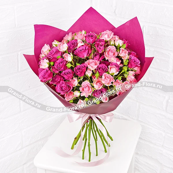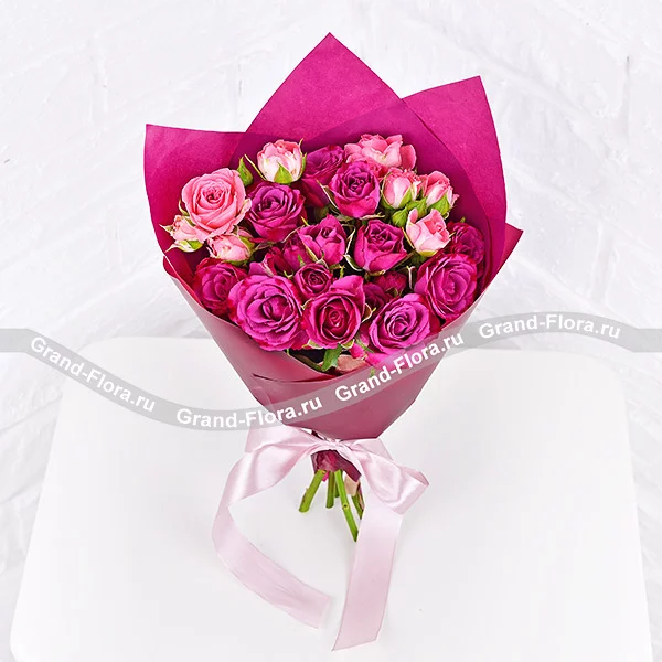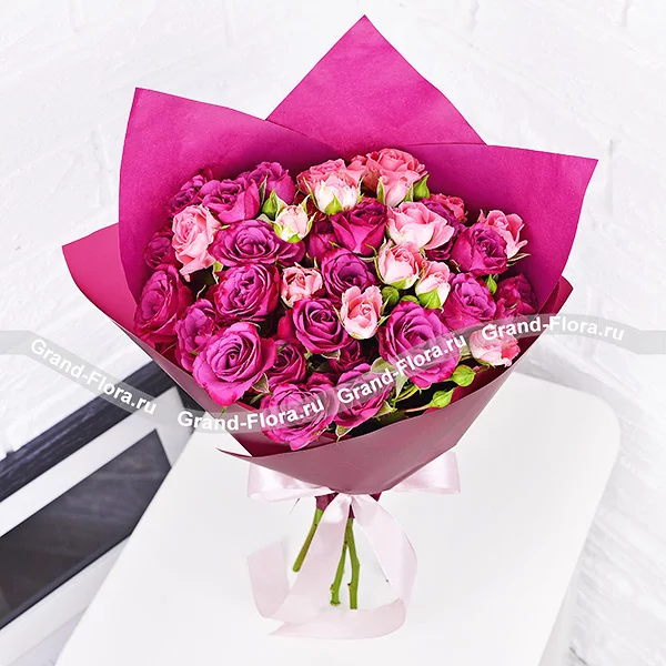 Невероятное сочетание розовых кустовых роз и восхитительных фиолетовых кустовых роз, уютно располагается в стильной упаковке созвучных цветов и перевязано нежной розовой лентой. Высота букета от 30 см, диаметр букета от 25см до 40 см, в зависимости от выбранного Вами варианта букета. Обращаем Ваше внимание, что состав и оформление букета могут отличаться.